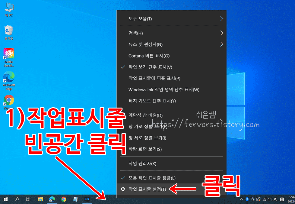 1. ① 작업표시줄 빈 공간에서 마우스 오른쪽 단추를 누르고, ② 맨 아래 [작업표시줄 설정]을 클릭합니다.