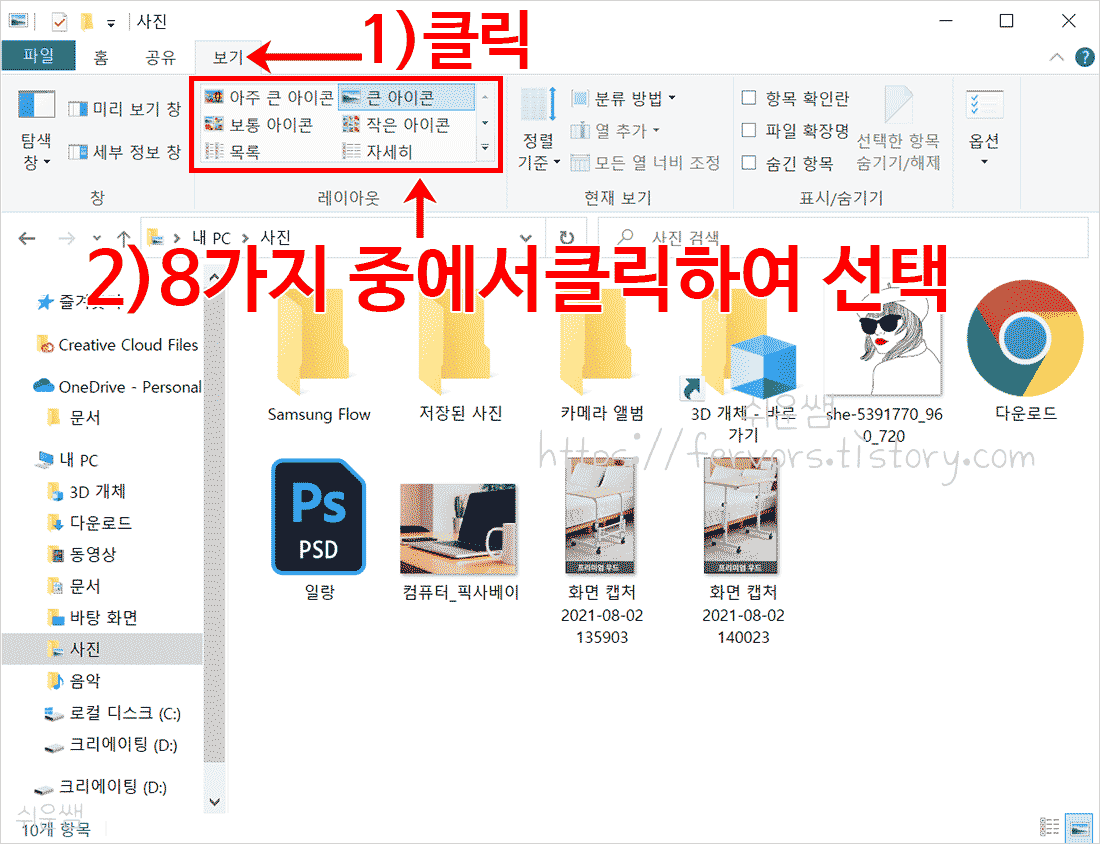 상단 메뉴에서 [보기] 를 누르고 8종류의 아이콘 보기 방법중에서 선택합니다.