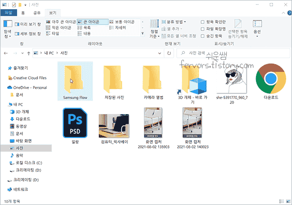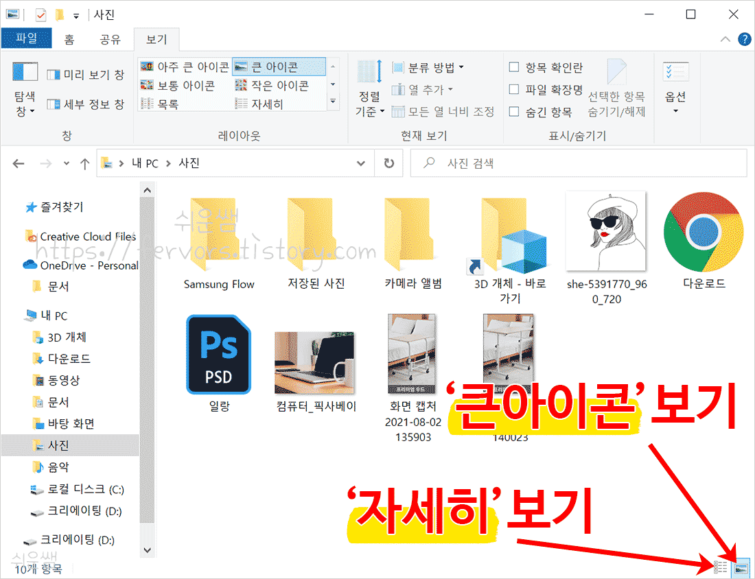 방법4) 가장 자주 사용하는 아이콘 보기 방법인 자세히, 큰아이콘이 창 맨 우측 하단에 누르기 편하게 있습니다. 여기를 클릭하여 선택하는 방법도 쉽고, 편합니다.