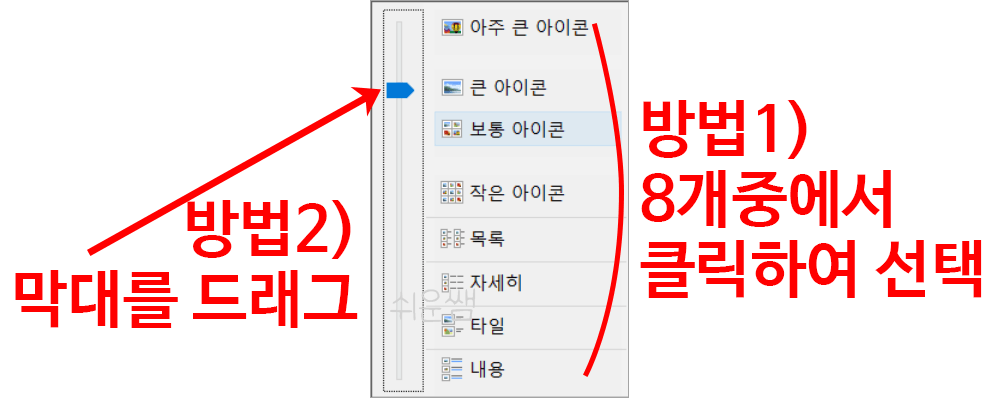 2. 보기 방식을 클릭하여 선택하거나, 왼쪽의 파란 막대를 드래그하여 실시간으로 미리 모양을 보면서 선택할 수 있습니다.