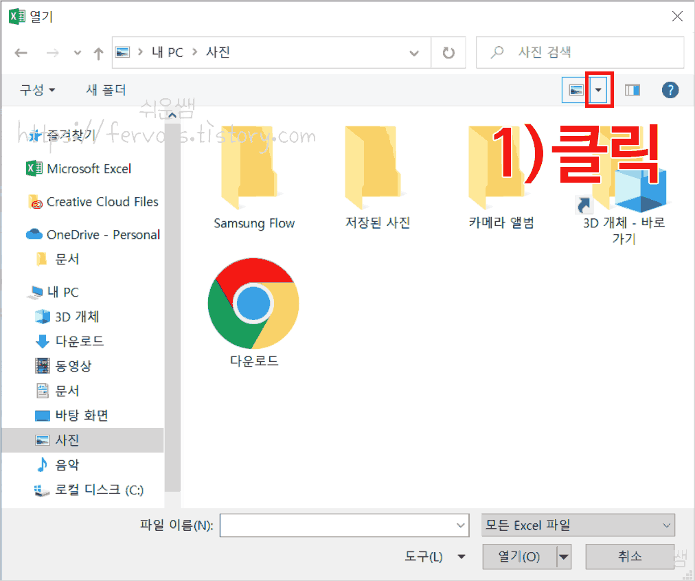 1. 열기, 저장하기 등 대화상자에서 오른쪽 상단의 ▼보기 목록 단추를 클릭합니다.