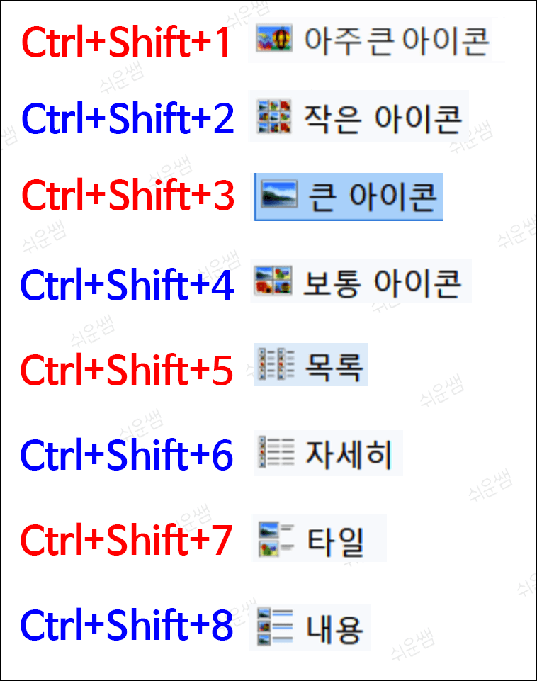 | • 아주 큰 아이콘 : Ctrl+Shift+1 | • 목록 : Ctrl+Shift+5 |