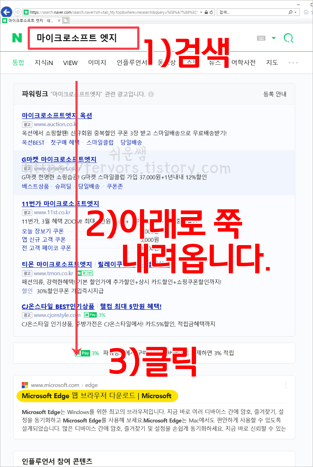 2. 네이버 검색 상자에 '마이크로소프트 엣지'로 검색하고, 아래로 쭉 내려가 광고 밑에 [microsoft Edge 를 웹 브라우저 다운로드]를 클릭합니다. (구글 검색 추천 : 바로 첫 번째로 뜹니다.)