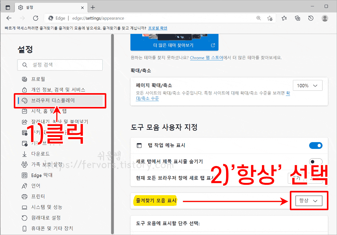 2. 왼쪽에서 [브라우저 디스플레이]를 클릭하고, 오른쪽에서 즐겨찾기모음표시 옆을 '항상'으로 설정해주세요.