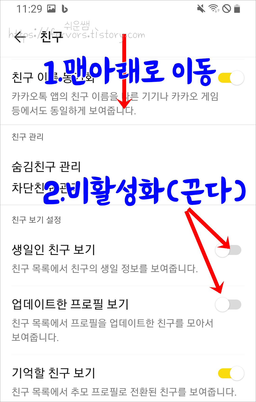 2. 화면 맨 아래로 이동해서, '생일인 친구보기' 와 '업데이트한 프로필 보기'를 눌러서 회색이 되도록 끕니다.(비활성화)