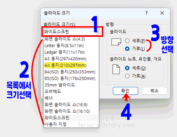 ① 슬라이드 크기 항목의 목록 상자를 클릭하여 크기 및 방향(가로, 세로)를 선택하고 [확인]을 누릅니다. → 이 목록에 A4용지도 있습니다.