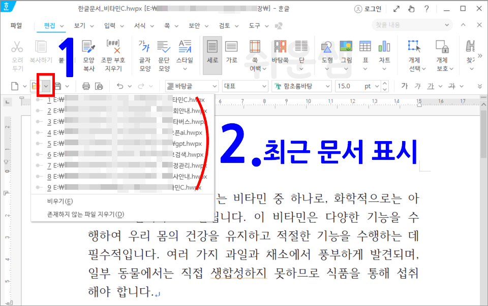 최근 문서는 파일을 간편하게 열어보는 데 도움이 될 수 있지만, 원치 않는 경우 삭제하거나 목록을 숨길 수 있습니다.