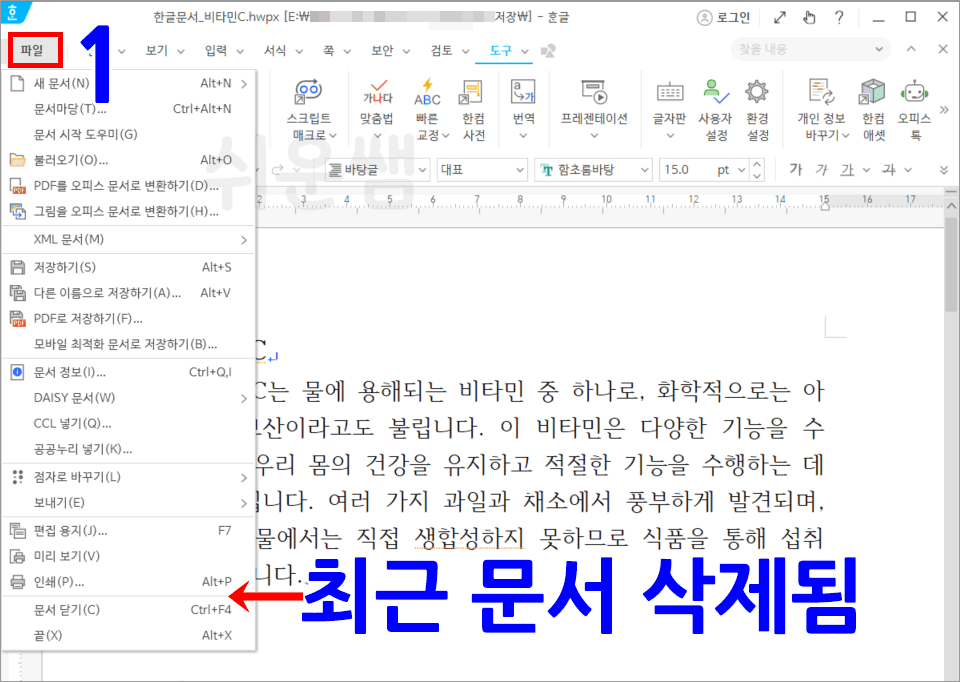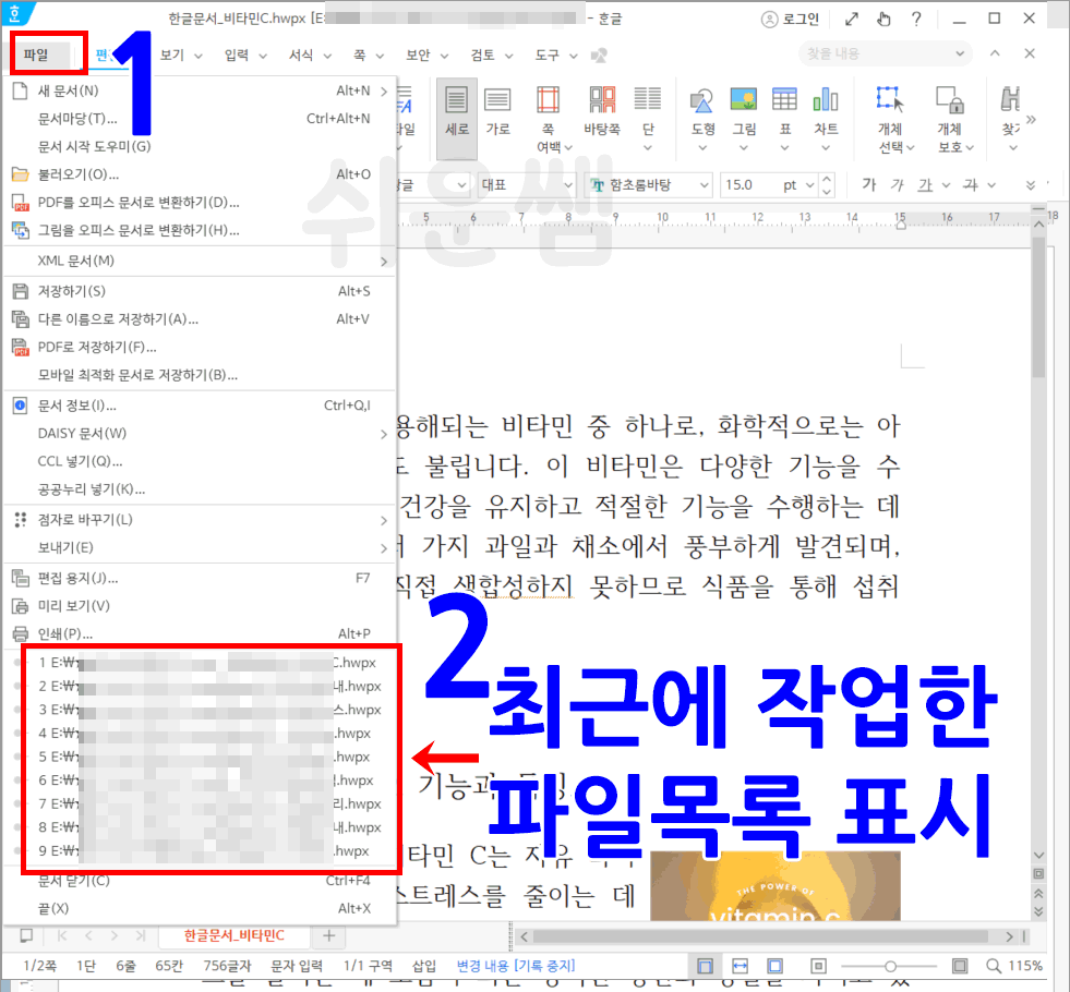 쉬운쌤입니다. hwp한글문서작성 메뉴의 [파일]을 클릭하면 최근에 작업한 파일의 목록이 표시됩니다.