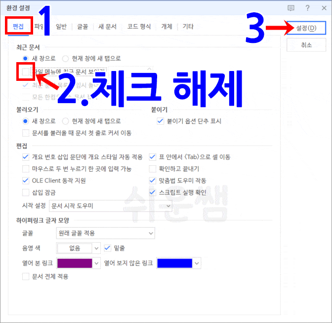2. [편집] 탭의 '파일 메뉴에 '최근 문서 보이기' 의 체크를 해제합니다. [설정]을 눌러 완료합니다.