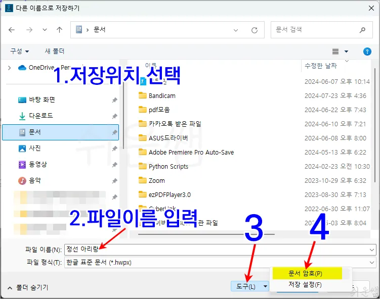 3. 저장위치를 선택하고, 파일이름을 입력한 후, 오른쪽 하단의 [도구]를 클릭하고, [문서 암호]를 클릭합니다.
