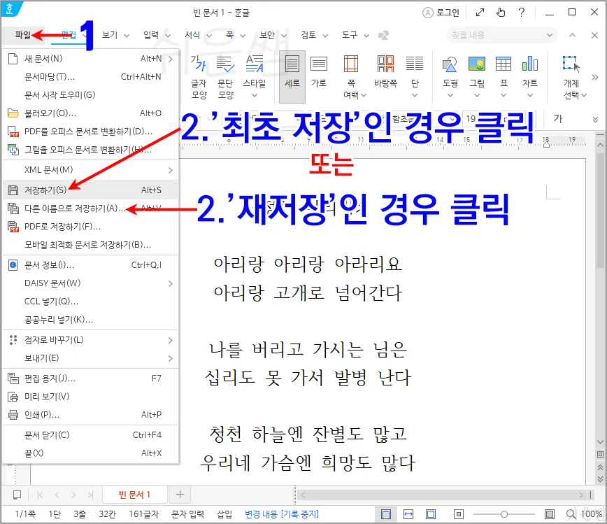2. [파일]을 클릭하고, 처음 저장하는 문서는 [저장하기]를 누르며, 기존 문서인 경우 [다른 이름으로 저장]을 클릭합니다.