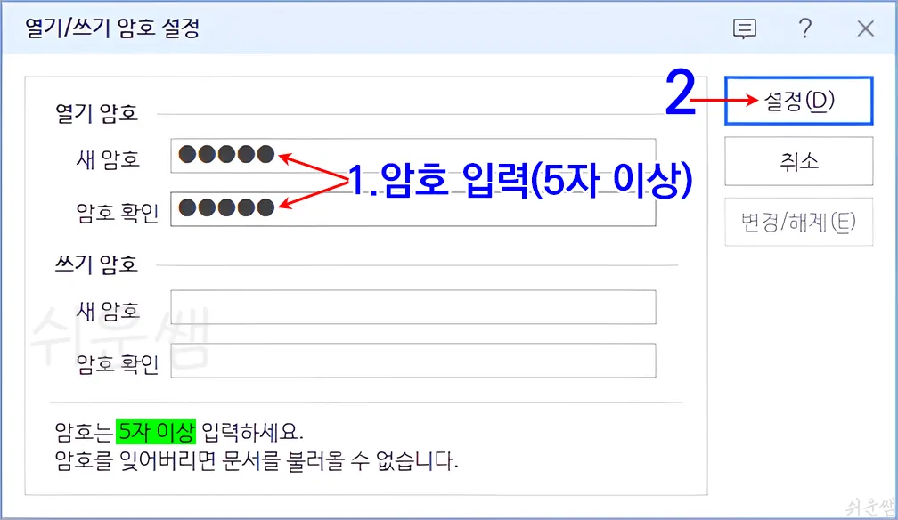 2) '열기 암호'칸에 원하는 암호를 5글자 이상 입력합니다. '쓰기암호'도 필요하면 그 아래칸에 입력해주세요. [설정]을 클릭합니다.
