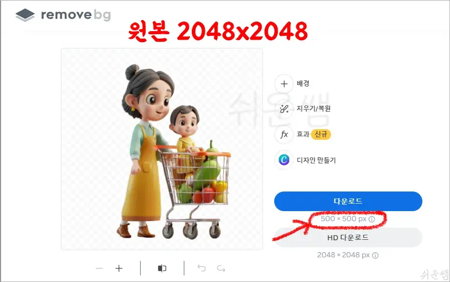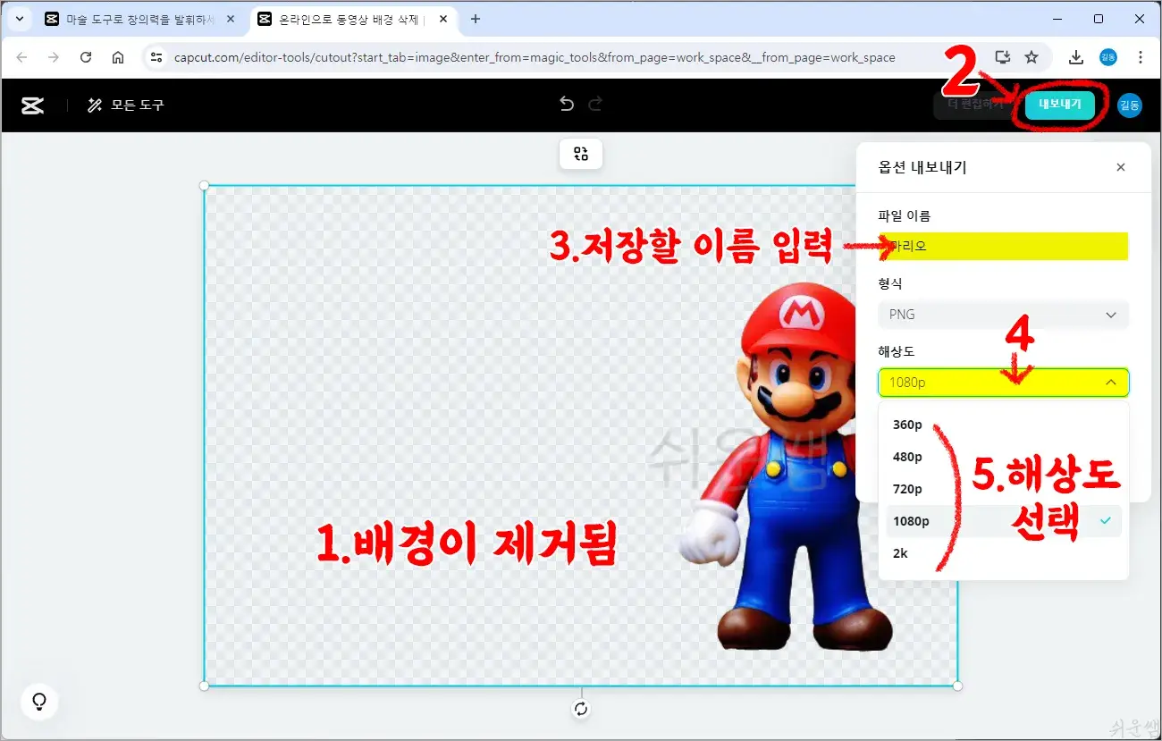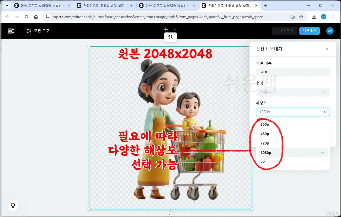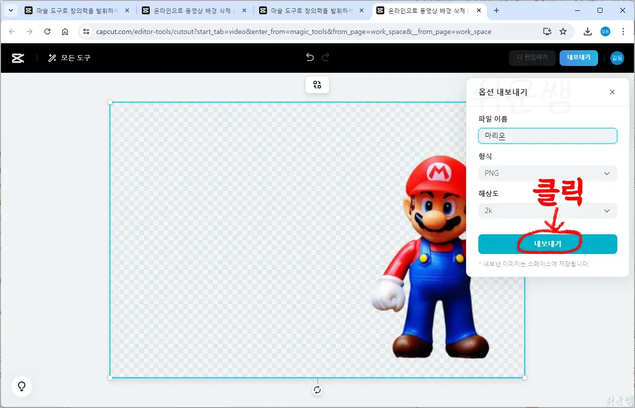 4.배경이 자동으로 제거되며, 저장을 하기위해 [내보내기]를 클릭합니다. 저장할 이름을 입력하고, 해상도를 선택합니다.