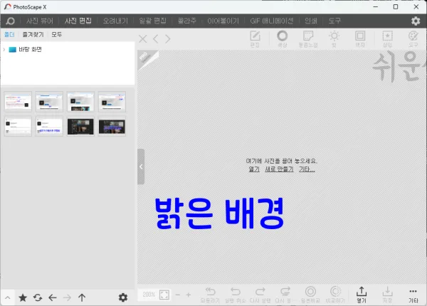 참고) 포토스케이프x는 기본으로 어두운 배경으로 실행됩니다. 아래와 같이 밝은 배경으로 변경할 수 있습니다.