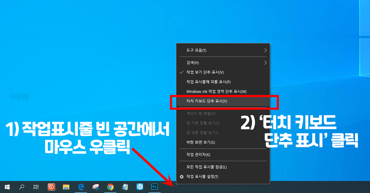 1) 작업표시줄 빈공간에서 마우스 우클릭 → '터치 키보드 단추 표시' 클릭