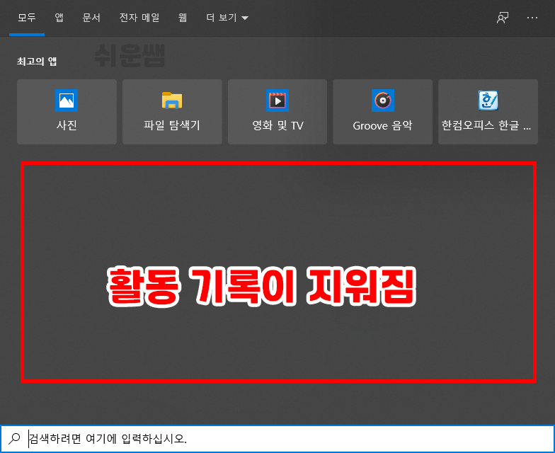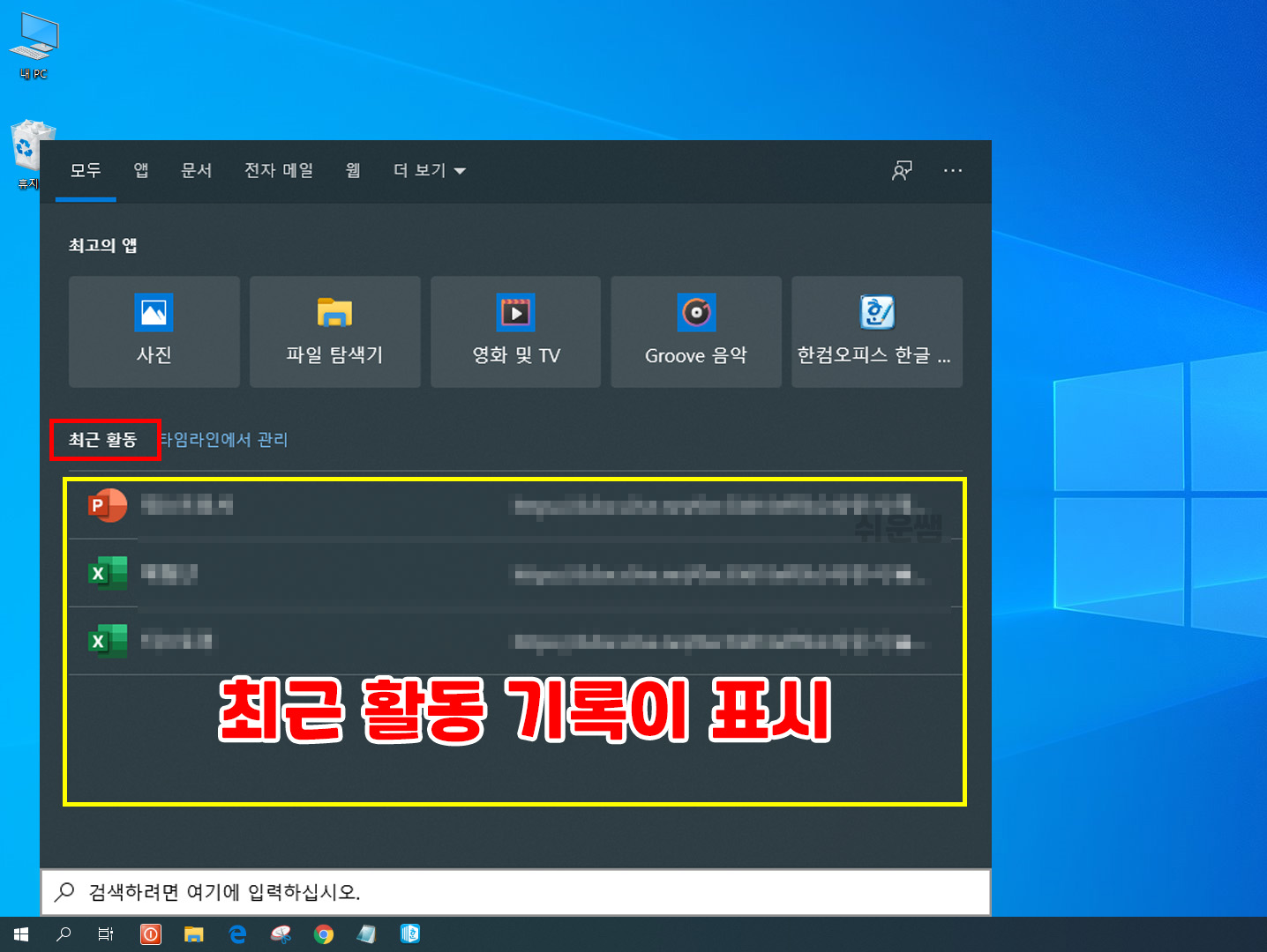 작업표시줄의 검색아이콘을 누르면 아래처럼 최근 활동이 보입니다. 거슬립니다. 다른 사람이 볼 수도 상황이라면 꼭 지워야 합니다. 이 '최근 활동' 내역을 삭제하고, 앞으로도 '최근 활동 기록'이 남지 않게 하는 방법에 대해 알아보겠습니다.