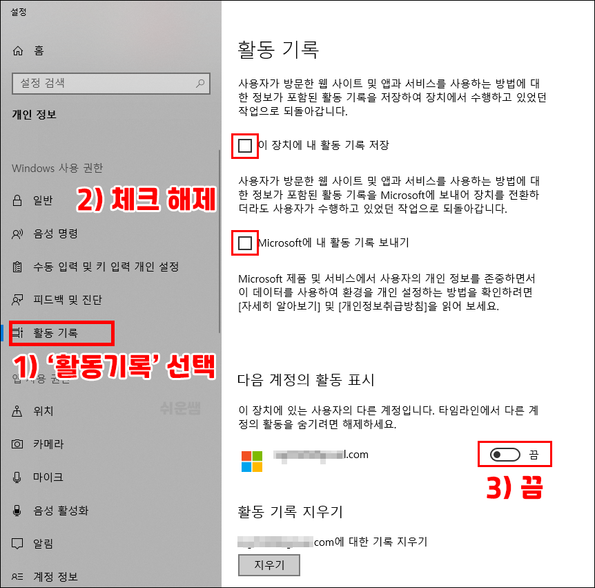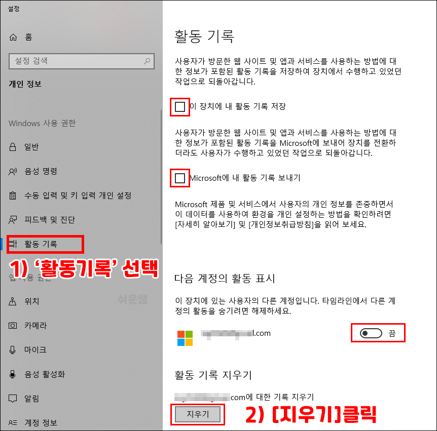 왼쪽 항목에서 [활동 기록] 선택하고, 오른쪽 아래의 활동 기록 [지우기]를 클릭합니다.