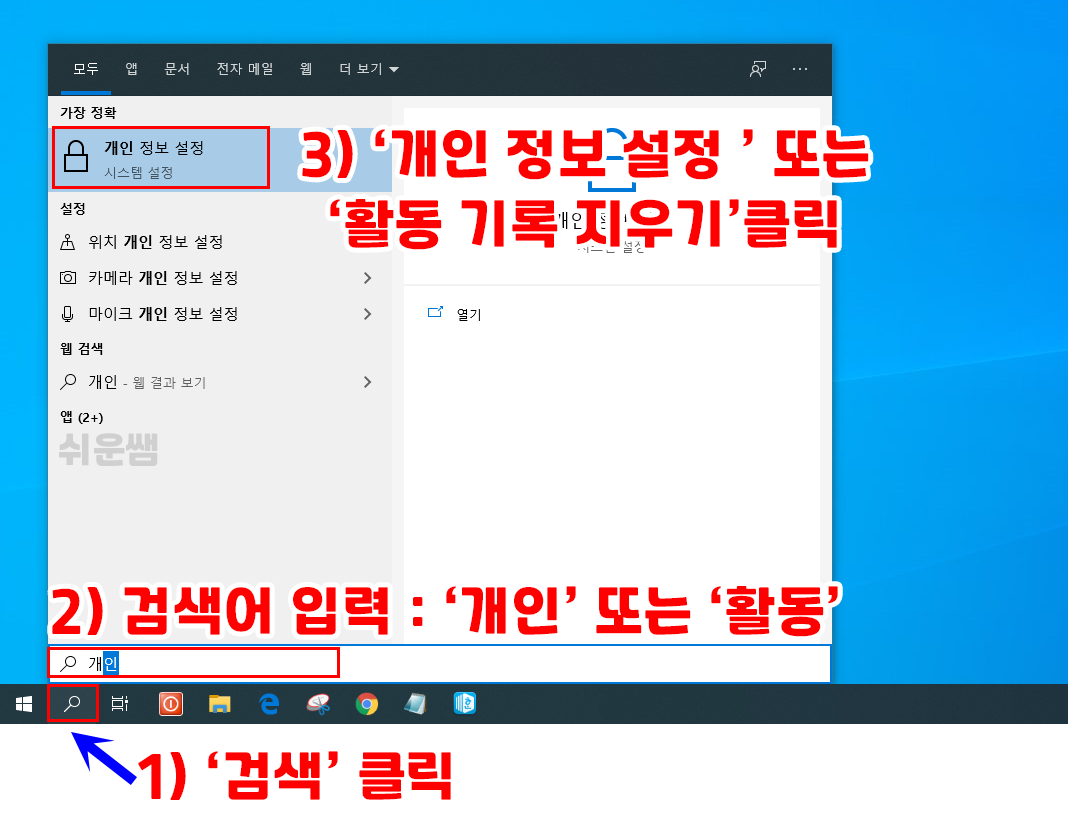 작업표시줄의 '검색아이콘'을 누르고, '개인 정보 설정'이나 '활동 기록 지우기'를 검색합니다.(띄어쓰기에 따라 결과가 안나올 수 있으므로 두 글자정도만 입력합니다.) → 위쪽 결과에서 [개인 정보 설정] 또는 [활동 기록 지우기]를 클릭합니다.