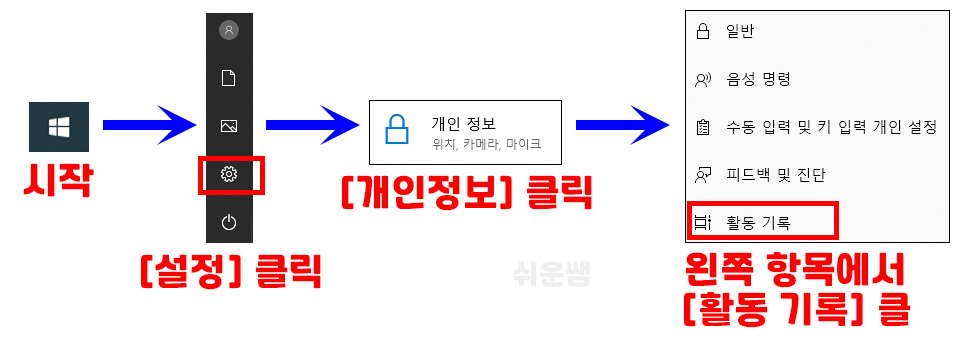 1) ① 작업표시줄의 [시작 단추]를 클릭하고, ② 톱니바퀴 모양의 [설정]을 클릭합니다. ③ 설정 항목 중에서 [개인 정보]를 클릭한 후, 왼쪽 항목에서 [활동 기록]을 클릭합니다.