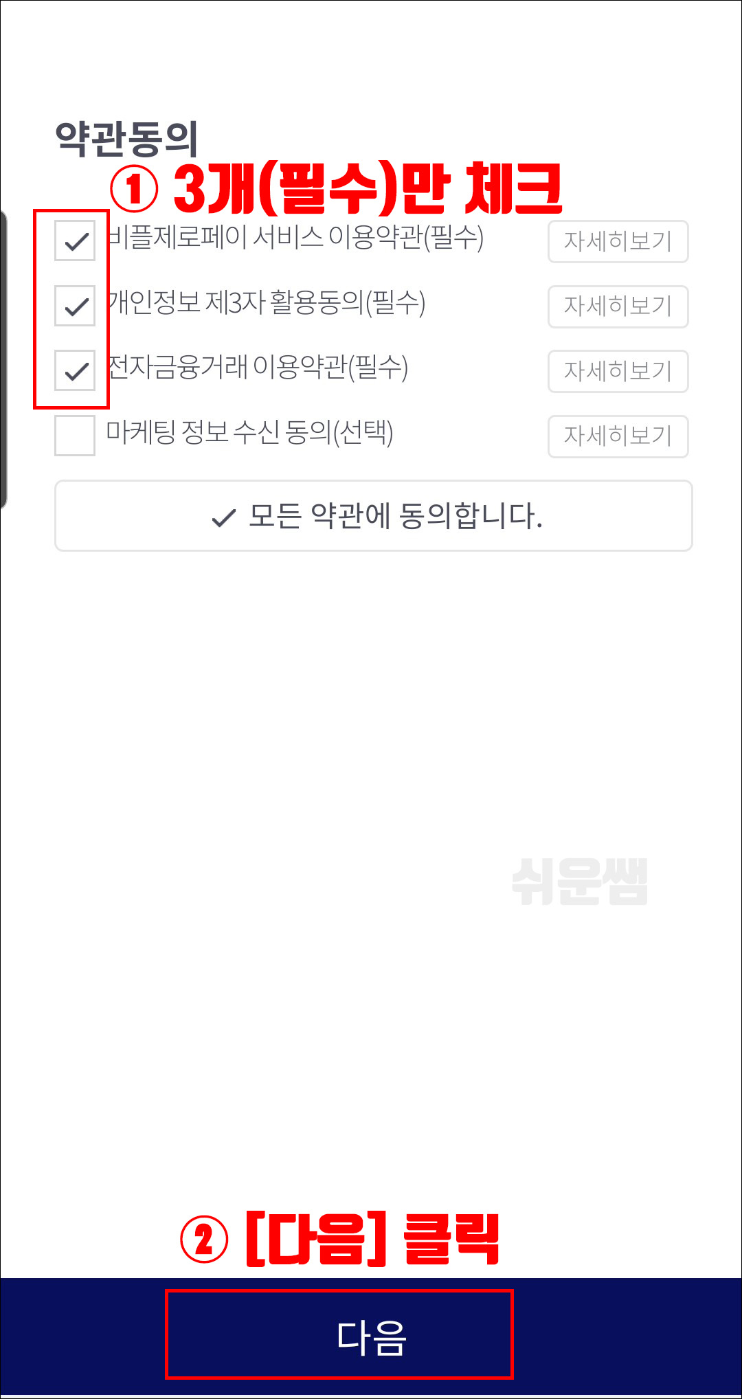5) 꼭~~~ 필수사항 3개만 체크 합니다.👌👌👌 맨 아래 [다음] 선택합니다.