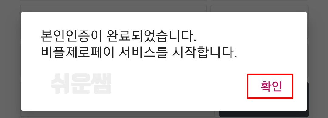 7) 인증이 성공하면 나타나는 메시지에서 [확인]을 선택합니다.