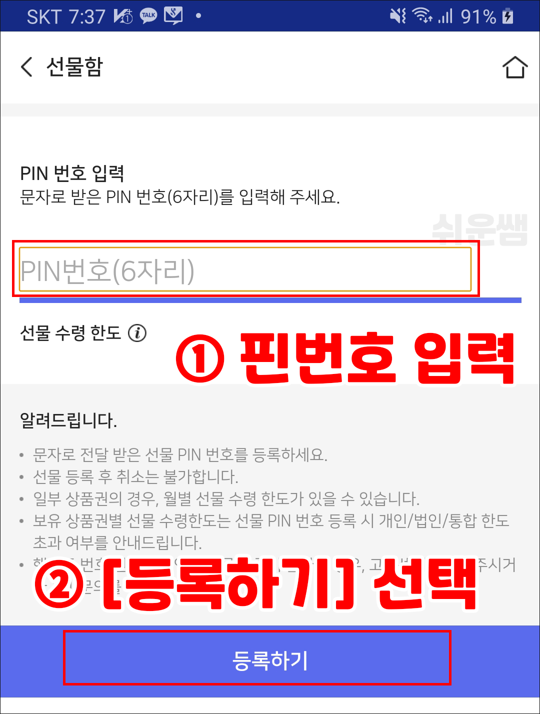 3) 핸드폰 문자로 받은 핀번호 6자리를 입력하고, 등록하기를 누릅니다.
