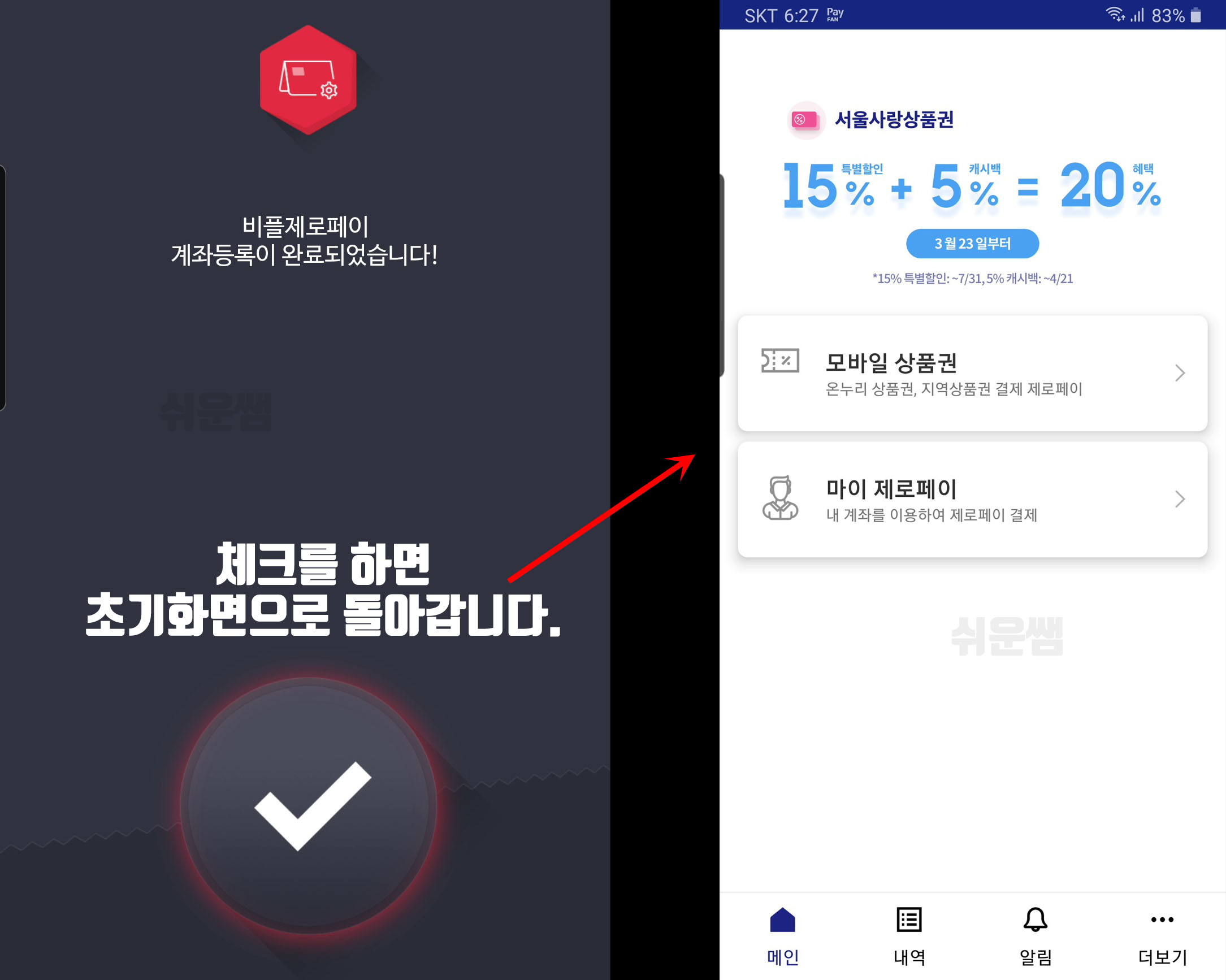 8. 계좌등록 완료가 나옵니다. → 초기화면으로 돌아갑니다.