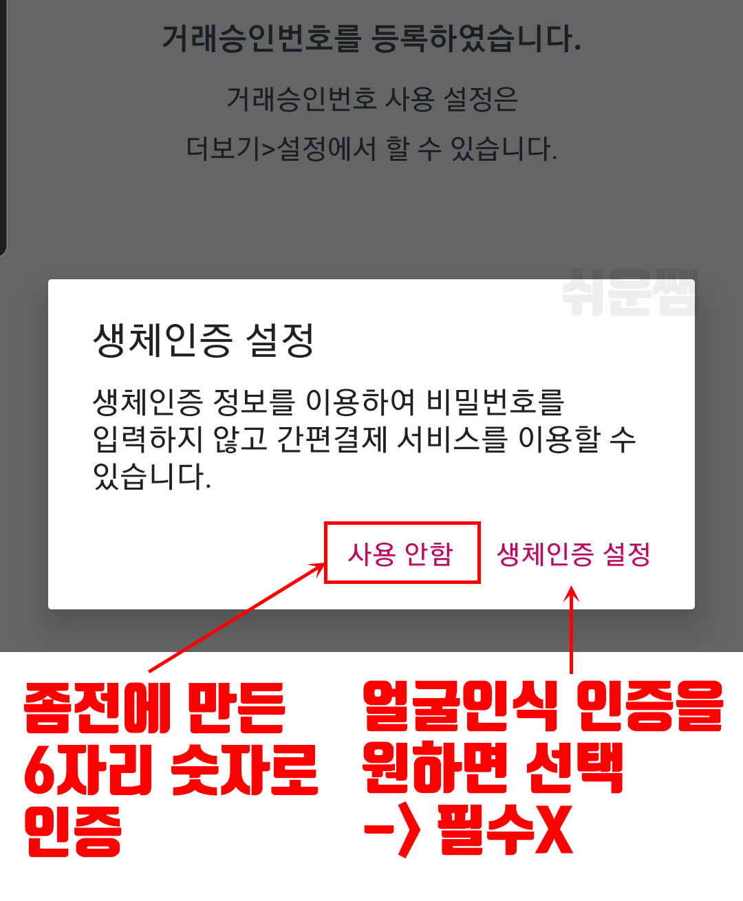 얼굴로 인증하는 기능을 추가하고싶은 분만 [생체인증 설정]을 누르면 됩니다. 나중에 언제든지 더보기 > 거래승인번호 설정 > 생체인증 사용에서 이 기능을 변경할 수 있습니다.