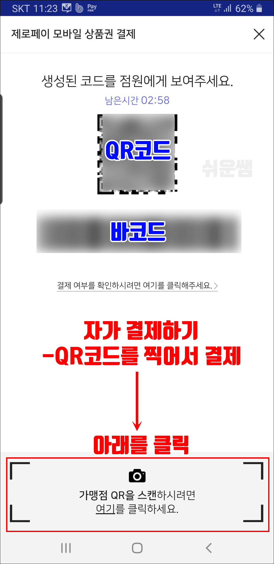 주의사항) 보여주기만하는 바코드 결제와는 달리, 모든과정을 구매자가 해야하므로, 번거롭고 조심해야합니다. 한두번 해보면 적응이 되긴 합니다.