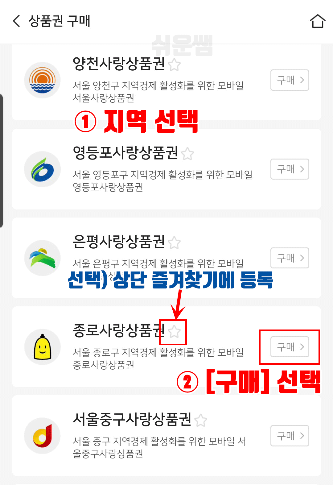 2) 목록에서 지역을 선택 → [구매] 선택