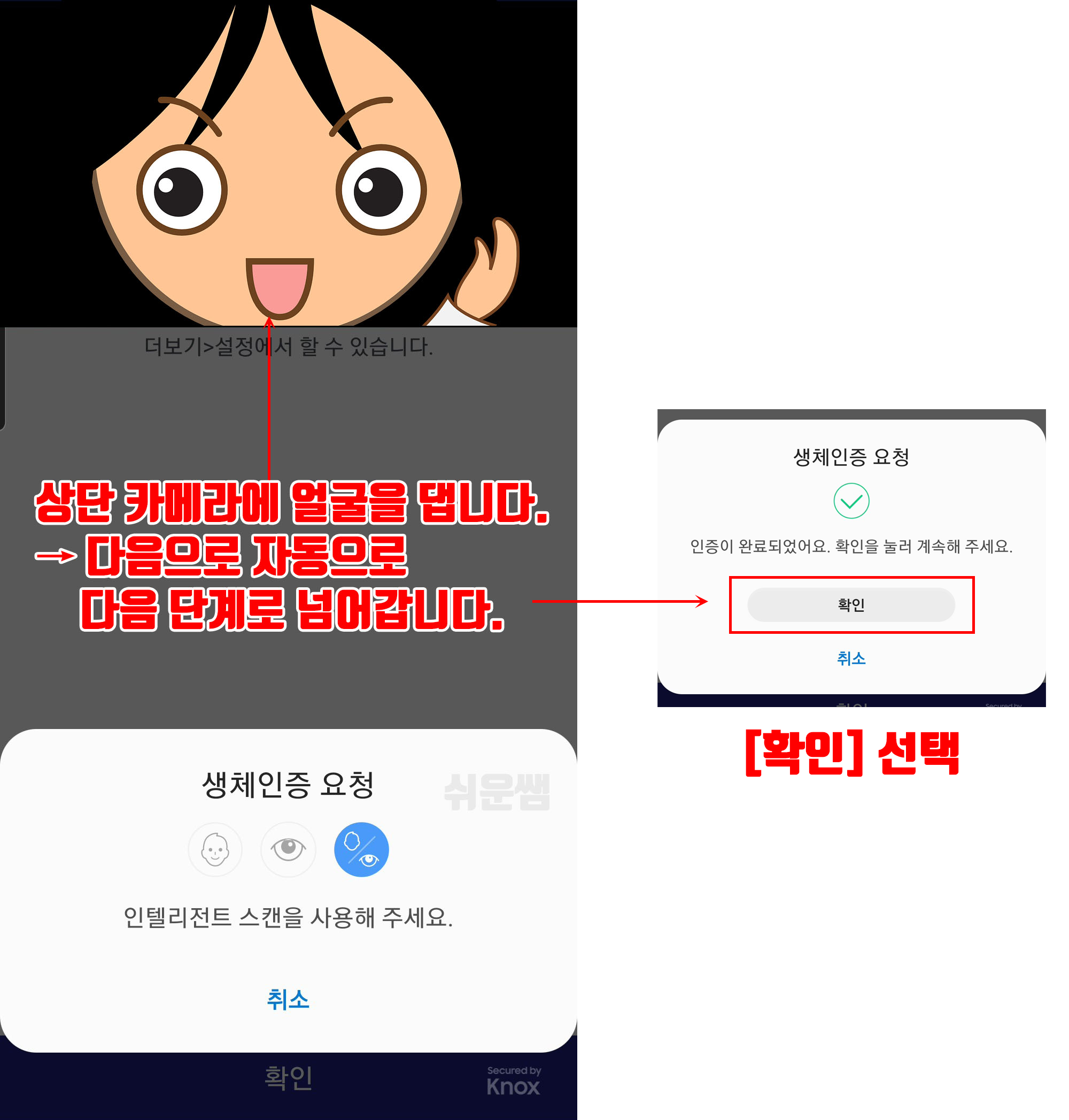 [생체인증 설정]을 선택 → 얼굴을 상단의 카메라에 댑니다 → 인증완료에서 [확인] 선택