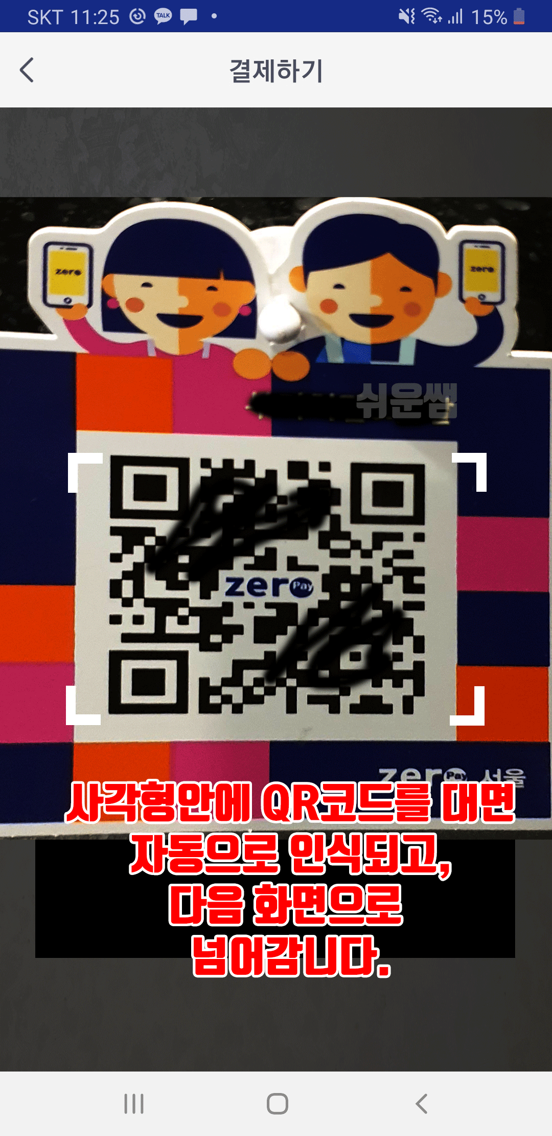 카운터에 아래와 같은 QR코드가 있는 매장은 제로페이 가맹점입니다. 이 QR코드를 찍어서 직접 결제하는 방법입니다.