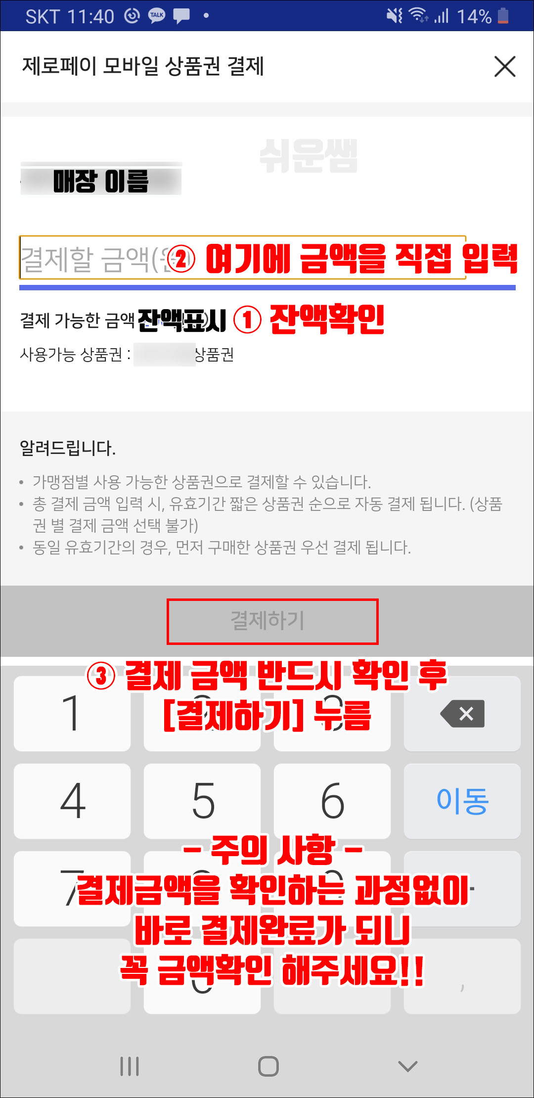 ① 잔액을 확인 ② 결제 금액을 정확히 입력합니다. → 즉시 결제되니 꼭 금액을 다시 확인 후 [결제하기]를 누릅니다.