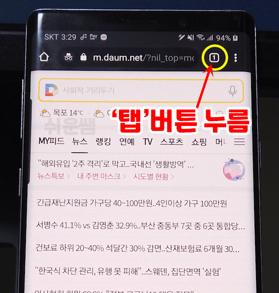 1) 열려있는 탭의 목록을 보는 상단의 [탭] 버튼을 누릅니다.