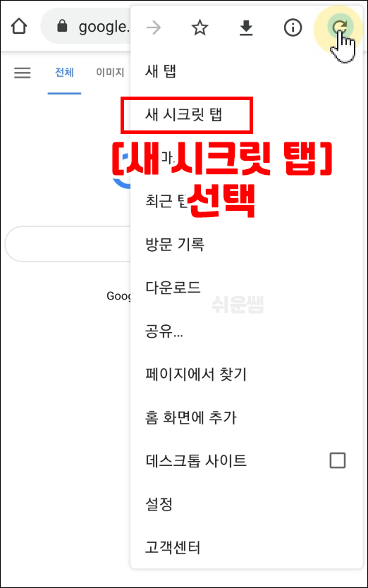 3) 더보기 목록에서 [시크릿모드]를 선택합니다.