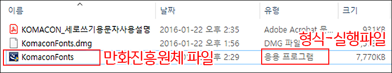 1) 압축을 해제하면, 폰트는 KomaconFonts.exe 로 실행파일형식으로 되어 있습니다.