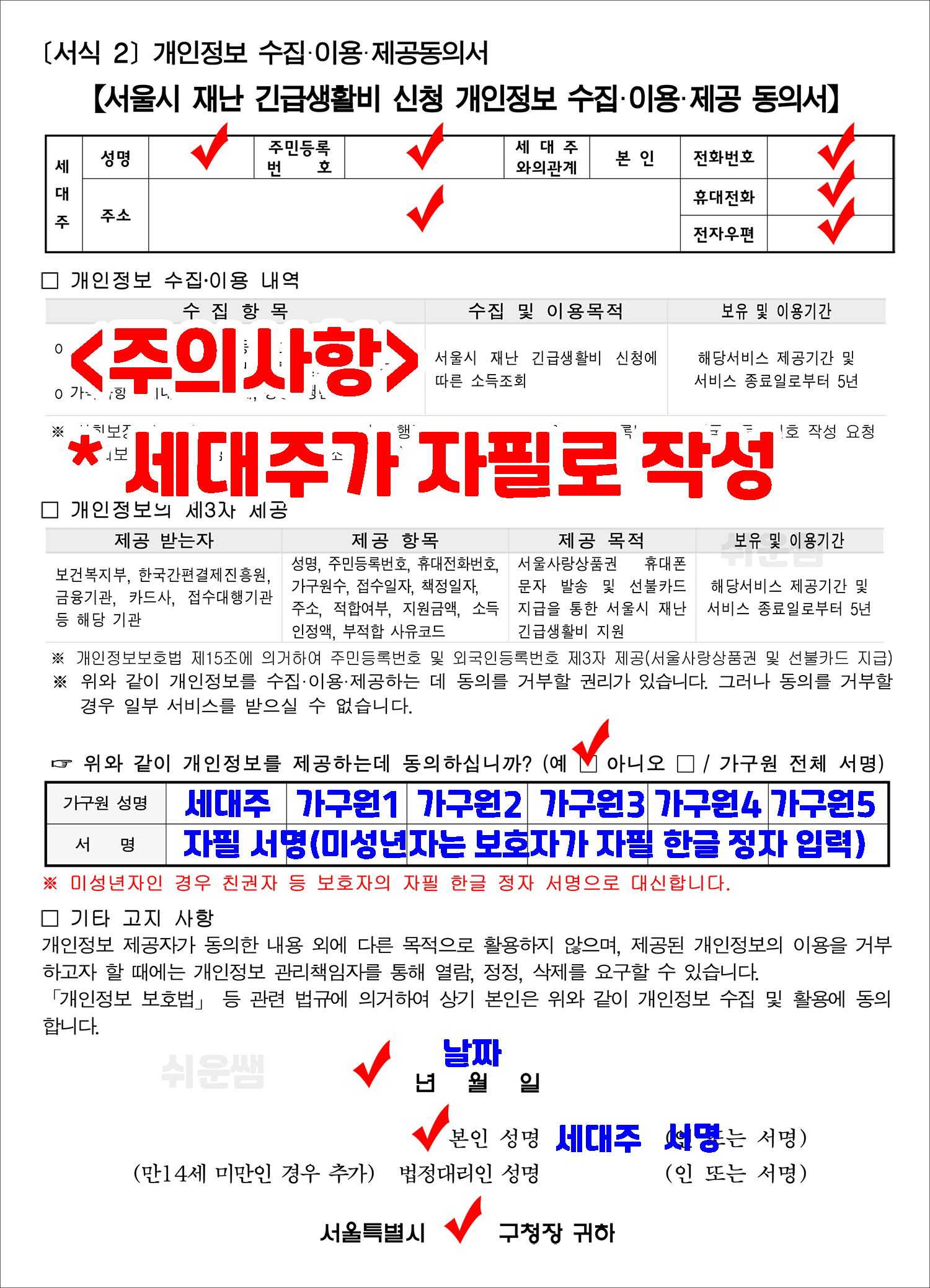 3. 출력한 종이 동의서에 내용을 수기로 작성합니다.(세대주 이름으로)