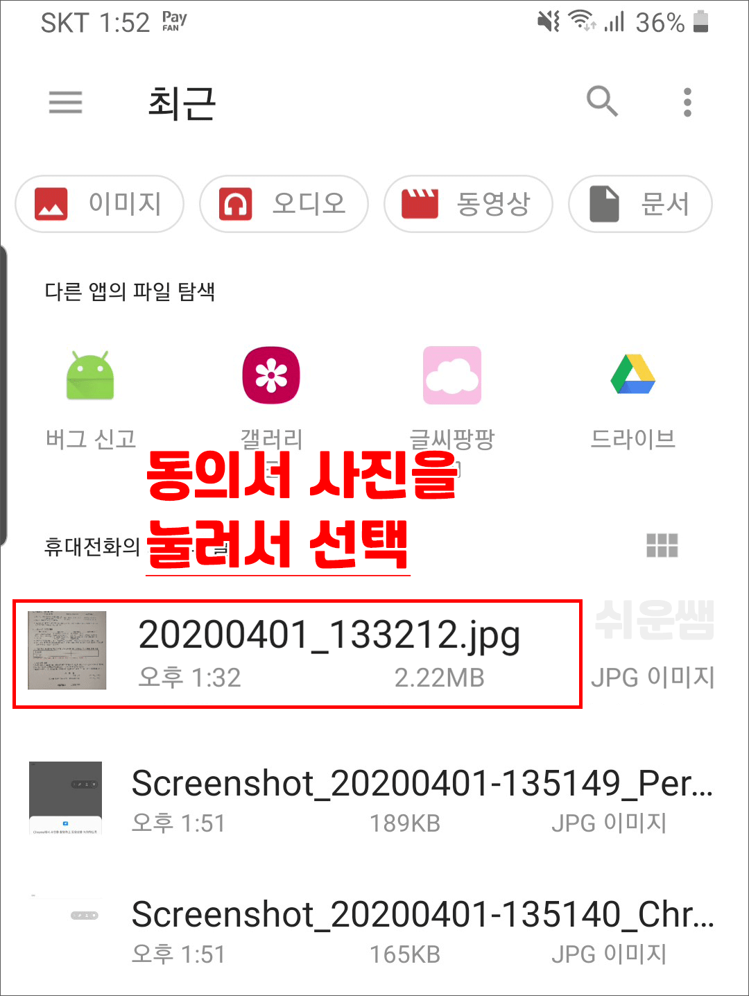 ⑦ 좀전에 동의서 사진을 찍었기 때문에 아마 위쪽에 바로 보일겁니다. 눌러서 선택합니다.