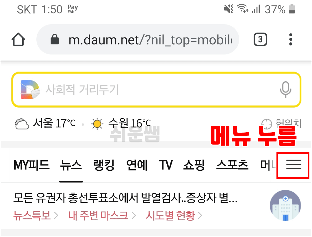 ① 스마트폰에서 다음 사이트를 열고, 메뉴를 누릅니다.
