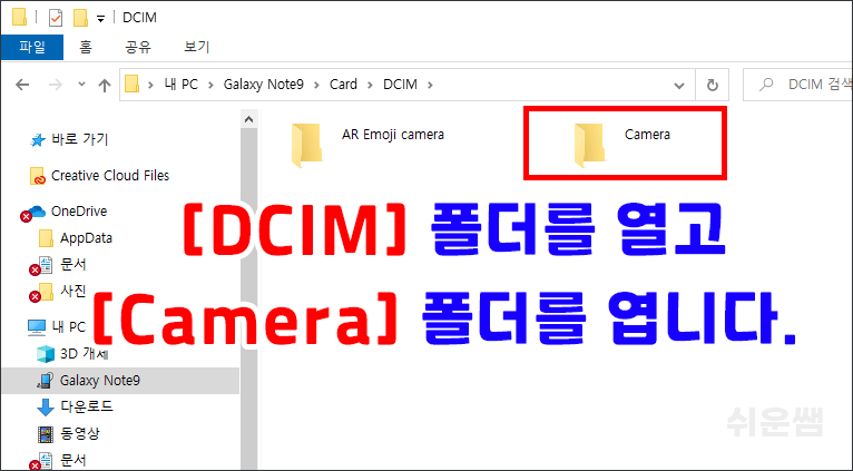 ⑥ 사진의 위치를 엽니다. [DCIM] 을 열고 → [CAMERA]카메라를 엽니다.