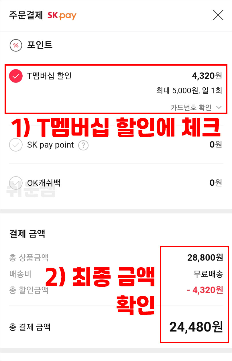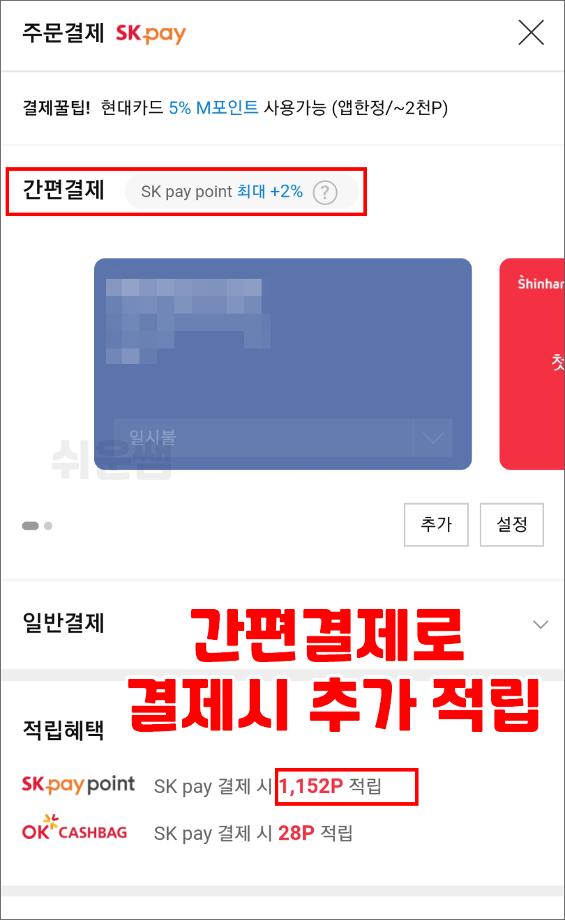 8. 결제를 합니다. 11번가를 자주 이용하는 분들은 간편결제 서비스인 'SK pay(신용카드를 11번가에 등록하고 결제)'를 하면 추가 적립이 많이 됩니다.
