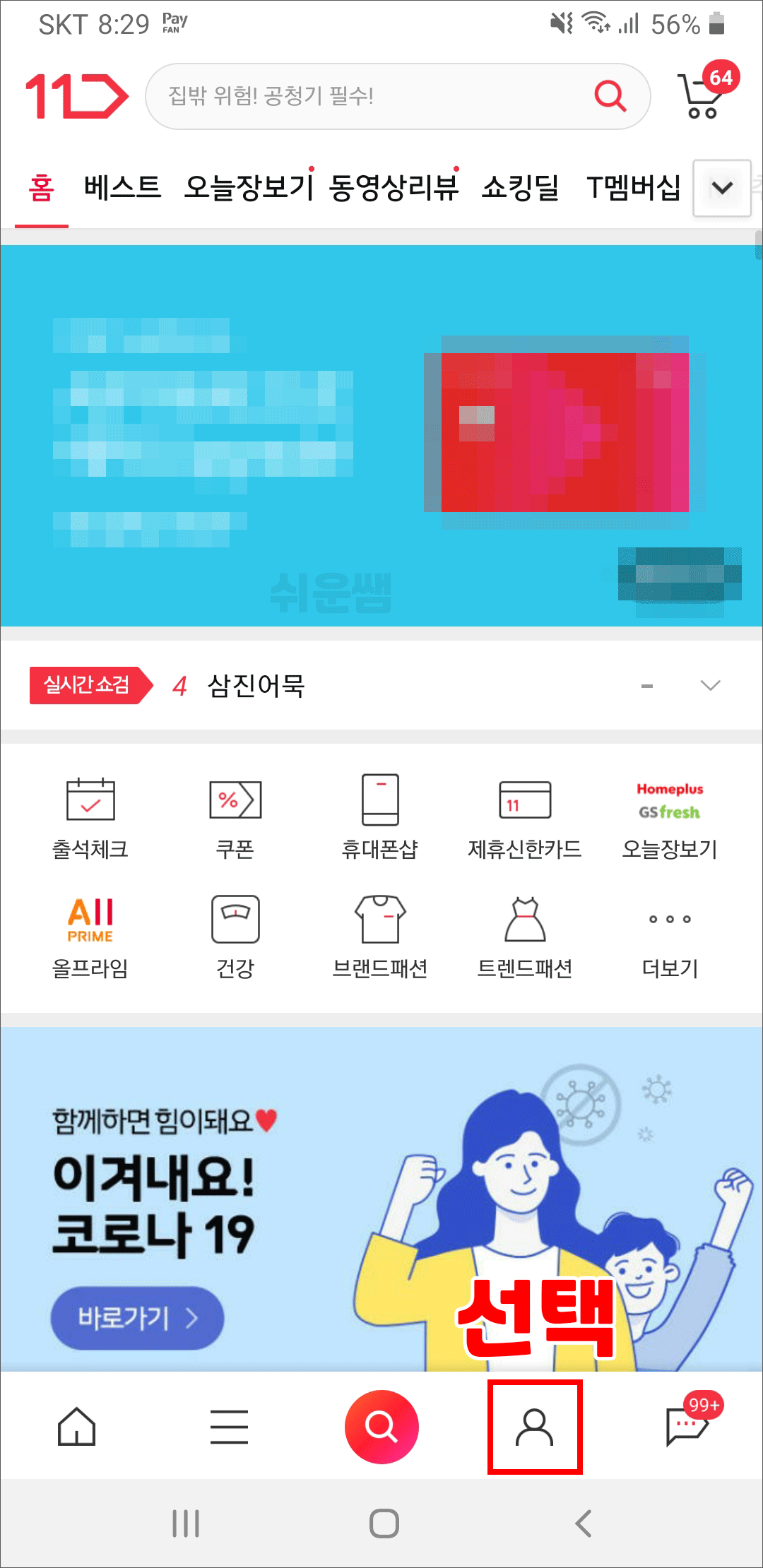 1. 11번가 앱을 열고, sk텔레콤 'T멤버십' 등록을 위해 화면 맨 아래 [나의 11번가]를 누릅니다.