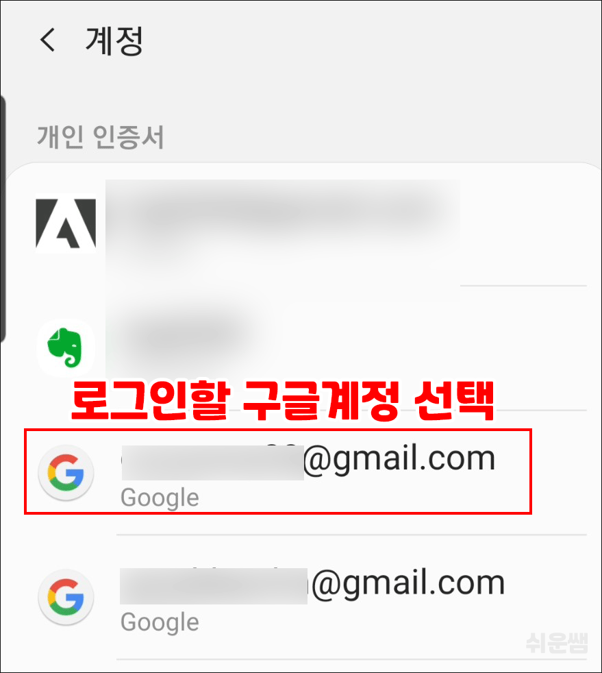 8. 계정목록에서 로그인할 구글 계정을 탭하여 선택합니다.