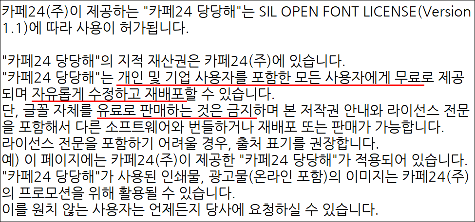 무료 폰트라는 것만 보고 다운받아 사용하면 안 됩니다. 개인만 비상업적으로 무료인 경우가 굉장히 많습니다. 그래서 곤란을 겪는 경우도 꽤 있습니다. (예를 들면 유튜브 영상에 개인용 무료폰트 사용하면, 광..