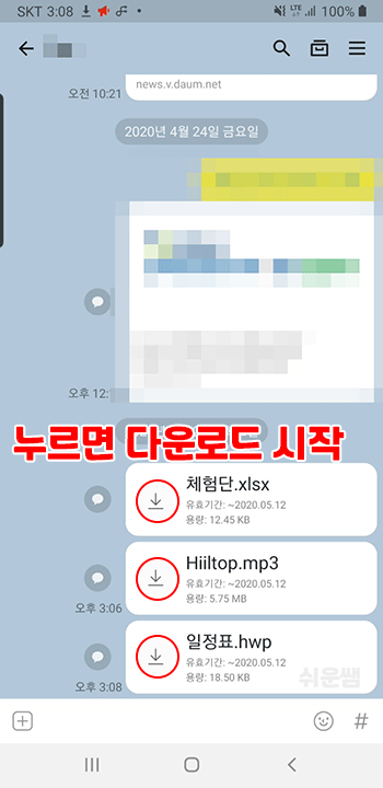 1. 카카오톡에서 파일 다운로드 - 파일 옆의 다운로드 버튼을 눌러서 다운로드를 합니다.