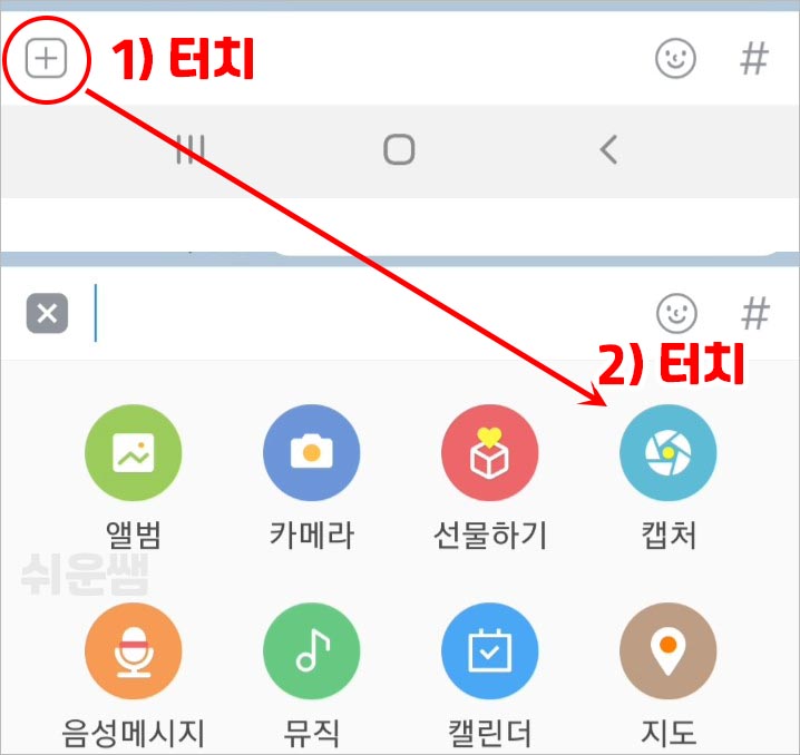 1. 카톡내용캡처하기 - 내용입력창 왼쪽의 [+] 누르고, [캡처]를 선택하면 캡처할 수 있습니다. 꼭 카톡캡처는 이방법으로만 되는 것은 아닙니다. 본인 폰에 스크롤 캡처기능이 있는 분들은 (스크롤)캡처기능을 사용해도 됩니다. 하지만, 이 캡처기능을 사용하면 프로필을 숨길 수 있는 기능이 있는 등 장점이 있습니다.