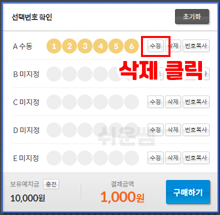 - 오른쪽 선택번호확인의 [수정]을 클릭하면, 왼쪽에 다시 번호가 표시됩니다. 이때 취소할 번호를 클릭하여 해제하고, 다시 다른 번호를 선택합니다. 번호수정이 끝났으면 [확인]을 누릅니다. 결과) 오른쪽에 번호가 수정한 걸로 바뀜